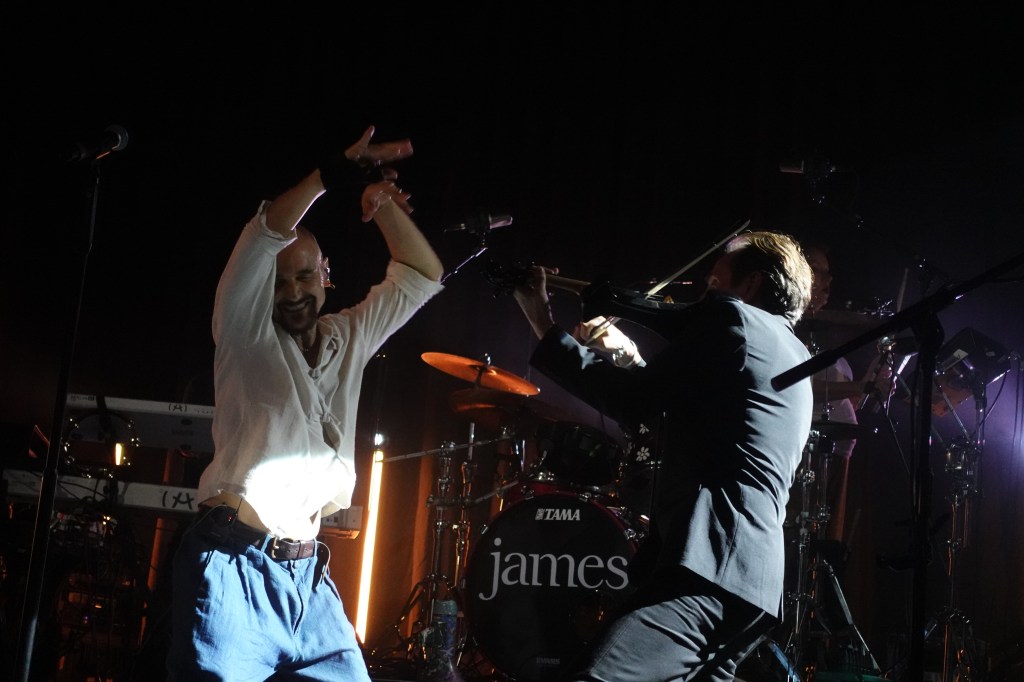 Due to thorough security checks, long queues still stretched down the street as the band was scheduled to take the stage, leading to a delayed start. Taking a cue from a similar situation in Brooklyn – though that delay was caused by traffic rather than security – they opened with the slow-burning, atmospheric ‘Attention’. ‘Say Something’ followed, marking Tim’s first journey to the barrier that evening. Up next was ‘Way Over Your Head’, the sole representative from Yummy in the first set. Despite being a newer track, it was met with a reaction just as ecstatic as the beloved Laid-era classics that have been part of the band’s catalogue for decades.